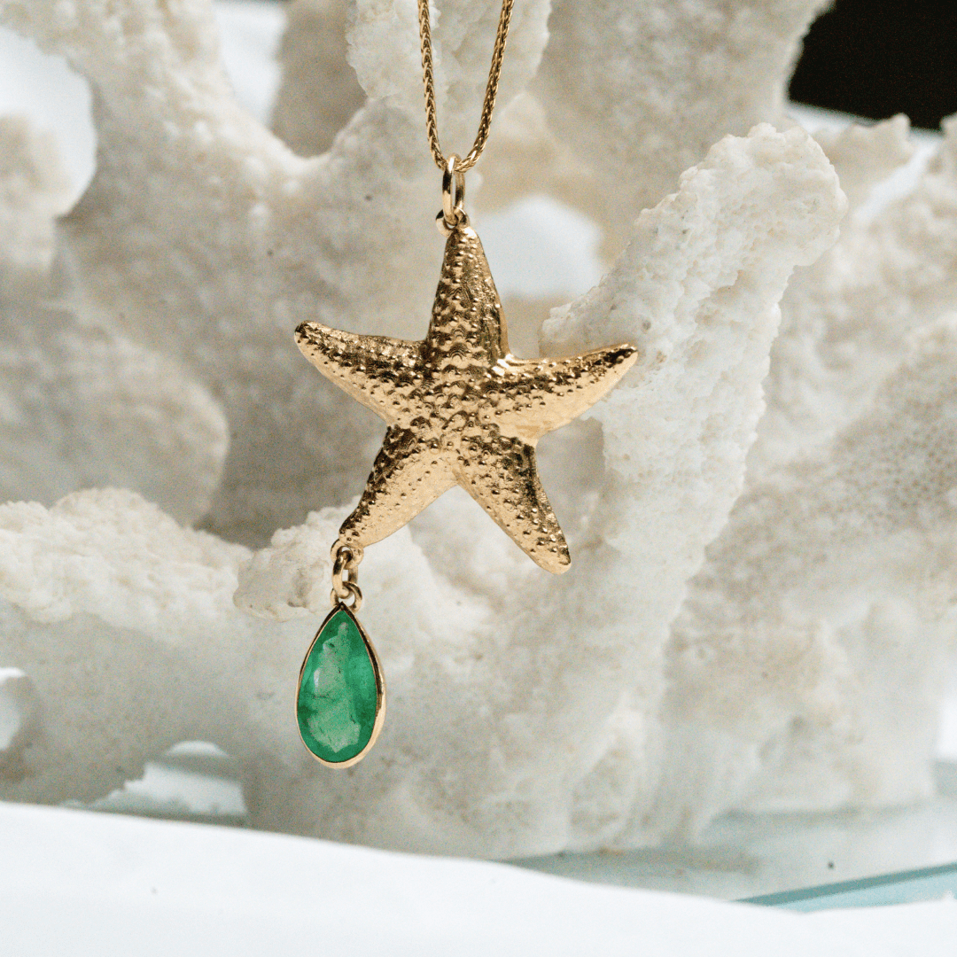 Celebrate the splendor of the cosmos and the artistry of fine jewelry with the 18K Gold Shining Star Pendant with Dangling Exquisite Colombian Emerald by Viviana Puello—a piece that captures the celestial beauty of the stars and the unmatched brilliance of one of nature’s most precious gems.